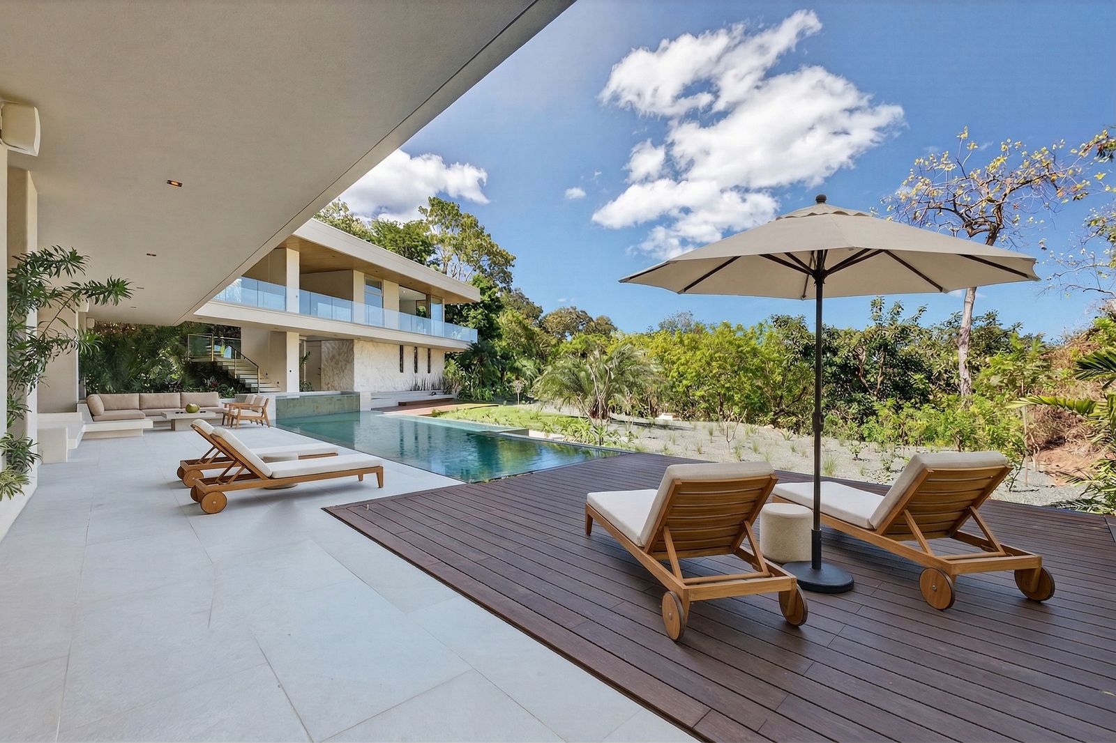 The warm palette of soft interior tones is complemented by natural oak accents, creating a modern yet inviting atmosphere throughout. The large imported sliding glass doors, allow an abundance of natural light to flood the interiors, blurring the boundaries between inside and out, and provide breathtaking tropical vistas to take center stage from all angles.