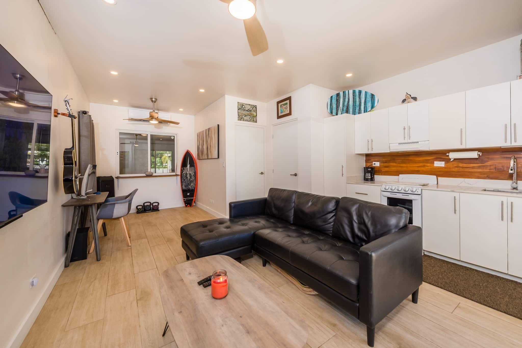 In the bright and airy, open concept living/dining room enjoy gorgeous, luxury furnishings, high end designer fans throughout, 3 extra large high end flat screen TV’s complete with surround sound systems.