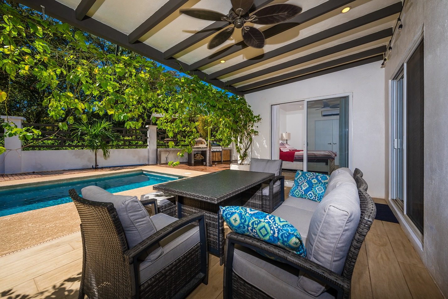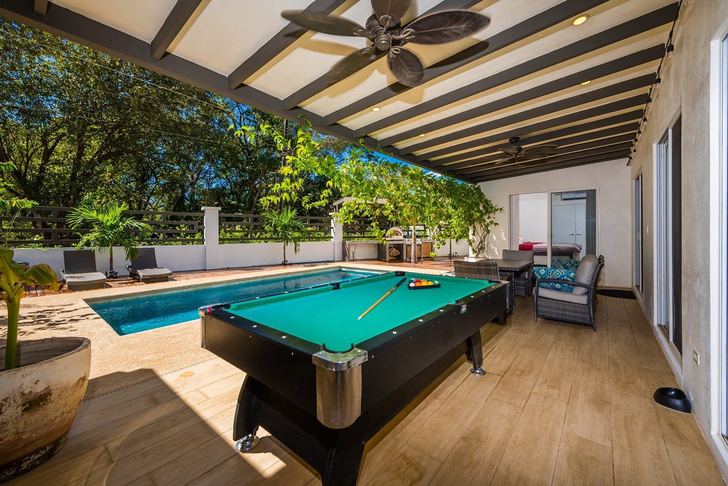 Soak up the sun on the palm-shaded, high end lounge chairs, cool off under your outdoor pool shower, shoot some pool, relax in your shaded hammock or chill out with a cool beverage at the covered, outdoor dining set enshrouded with lush greenery.