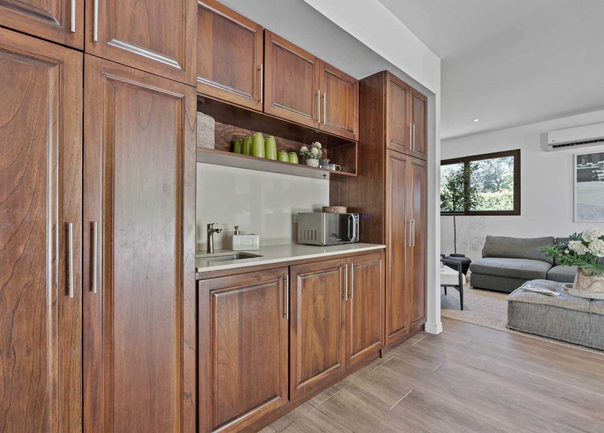 Crafted with premium materials, the home features high design, artisan ironwork, native hardwoods, and over 7,000 sq. ft. of covered living space. Designed with versatility in mind, the main property houses four master bedrooms and an Apartment. It features lovely tropical plantation-style architecture with hurricane shutters and a style that blends classic charm with contemporary elegance. Its symmetrical design creates a balanced and visually appealing facade, with central doors and windows framed by wide, uniform columns. This symmetry not only enhances the aesthetic appeal but also contributes to the home’s timeless allure. This interior design embodies a contemporary tropical design characterized by its use of natural materials, neutral tones, and a strong connection to the surrounding environment. The vaulted ceilings with exposed white-washed beams create an open and airy feel, enhancing the spaciousness of the spaces while maintaining a clean, minimalist vibe. Modern furniture pieces balance simplicity with comfort, ensuring a luxurious yet relaxed atmosphere.